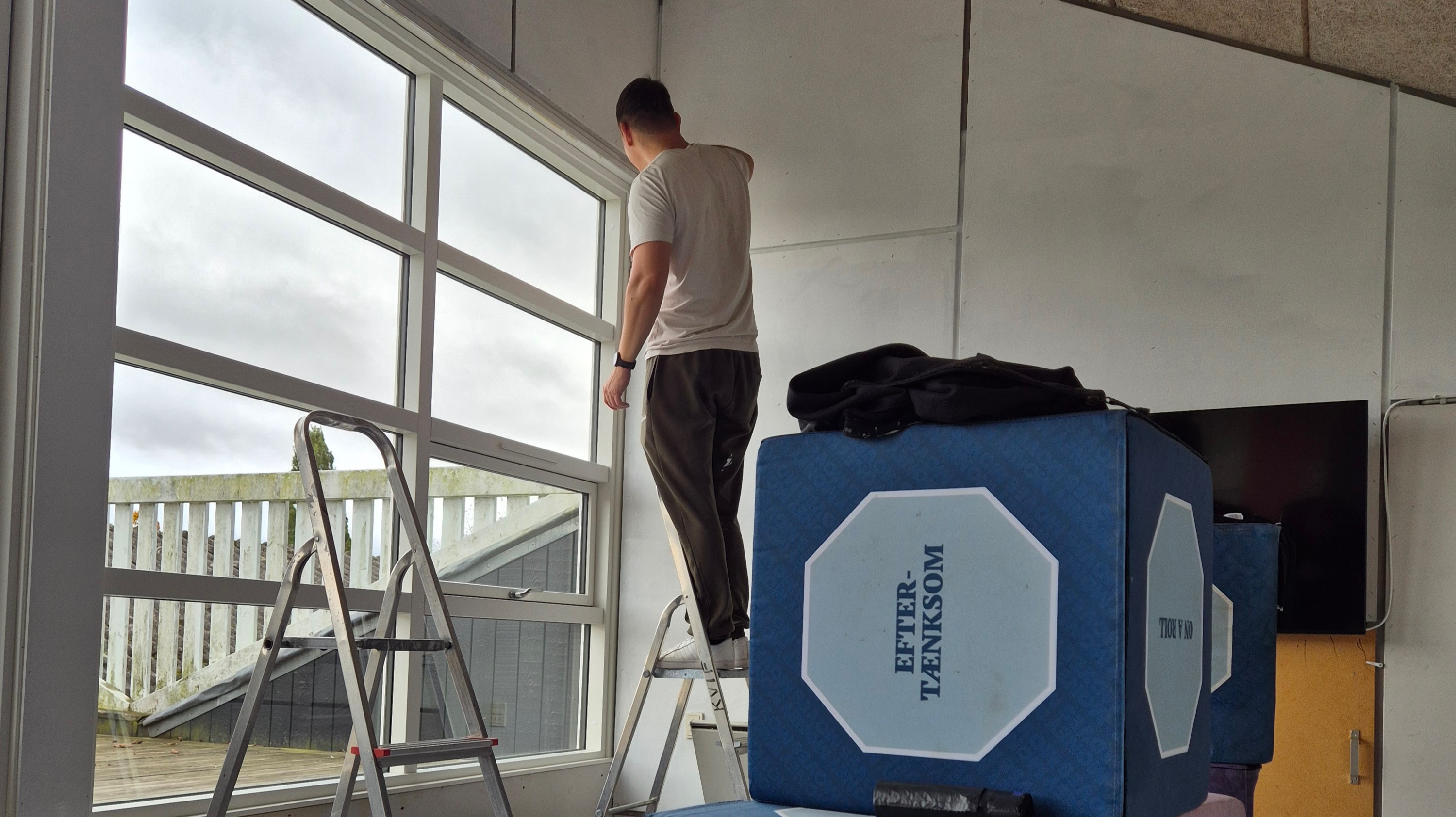 Flittige frivillige kræfter knokler på 1. sal med at omdanne tv-stuen til KVIF Fitness!